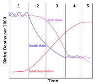 - lande med hastigt faldende fødsels- og dødsrater, hvor fødselshyppigheden mindskede hurtigere end dødeligheden, hvilket fører til faldende befolkningsvækst (Nord- og Vesteuropa, Nordamerika og Australasien)