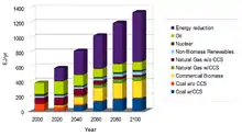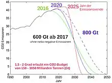 Skal denne situation undgås, må der kun indvindes en vis del af de nuværende reserver af fossile brændstoffer. Hvis man ønsker mere end 50 % sikkerhed for at nå 2°-målet, må der ifølge IPCC i tidsrummet 2011-2050 maksimalt udledes mellem 870 og 1.240 Gt (mia. tons) CO2, svarende til at en tredjedel af oliereserverne, halvdelen af naturgasreserverne og 80% af kulreserverne ikke må indvindes, men skal blive liggende nede i jorden.[23]