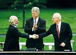 Hussein af Jordan og Yitzhak Rabin giver håndtryk, bevidnet af Bill Clinton, under de Israelsk-Jordanske fredsforhandlinger den 25. juli 1994.
