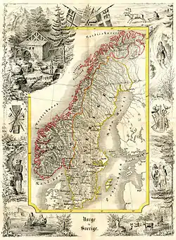 ![]() Kort over Sverige og Norge med mellemrigsgrænse fastsat 1751 | |||||||||||||