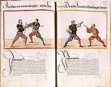- Bemærk at den historiske benævnelse Fechtschule "fægteskole" ikke referer til "den tyske skole", men til individuelle fægtekonkurrencer, der blev afholdt i den tidligere moderne periode, svarende til de engelske Prize Playings.