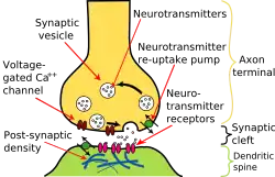 Oversigt over en synapse mellem et neurons axon og en dendrit tilhørende et andet neuron. Synapsen udgør en kløft mellem de to neuroner. Elektriske impulser kommer til enden af axonet, og udløser kemiske meddelere (neurotransmittere), som bevæger sig over synapsekløften til receptorerne på dendrittet, hvor det sender impulsen videre til det andet neuron. Efter videregivelsen bliver neurotransmitteret hurtigt metaboliseret eller genoptaget i neuronet, hvor de blev udløst fra. Antidepressiva har generel indflydelse på disse processer.