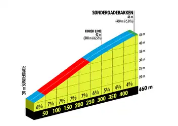 Den legendariske rundstrækning med start og mål på toppen af Søndergade, fortsættes ad Hammelvej mod vest. Ved Neder Hadstenvej drejes til højre ad sammen vej, hvor rytterne forsætter til rundkørslen neden for bakken. Her svinges til højre ad Søndergade, der med sine 5,8% i gennemsnitlig stigning,[10] er berygtet bland cykelryttere.