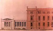 Indgangen til bygningen har en fronton med søjler i jonisk stil og en lille trappe. Megaron har en dobbelt række af ni vinduer, som hver er kronet af en lille fronton. Ziller valgte at udvide frisen mere end normalt. Dens karakteristika er de dekorative gipsmetoper, der veksler med dobbeltvinduer. På den måde sikrede han sig en mere naturlig belysning på tredje sal men også plads til kongeparrets monogrammer, "K" for Konstantinos og "S" for Sofia.[2] Der var oprindelig statuer på hjørnet af brystværnet, men deres senere skæbne er ukendt - de siges at være blevet fjernet i 1940'erne eller 1950'erne.