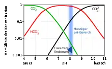 I denne ligevægt indgår oxoniumionen, H3O+, som bestemmende for pH. En stigning i oxoniumionens koncentration vil betyde et fald i pH. Faldet i pH betyder en forskydning mellem carbonat og hydrogencarbonat, da hydrogencarbonat er mere opløseligt ved lavere pH. Resultatet betyder et fald i carbonat-koncentrationen, og dermed ændres forudsætningen for dannelsen og stabiliteten af calciumcarbonat.