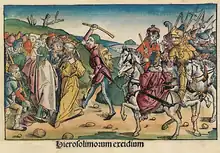 Naboerne, især edomitterne, deltog i plyndringerne. Templets skatte røvedes og bortførtes, byen brændtes og kongen med en skare beboerne førtes bort til Babel; kun de fattigste blev ladt tilbage. Om livet i Palæstina, hvor Gedalja indsattes, men kort efter myrdedes, vides ikke meget andet end, at jøderne delvis blandede sig med den øvrige befolkning.[1]