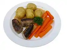 - Stegt and, gås eller flæskesteg med æbler, svesker, brunede kartofler, rødkål og brun sovs