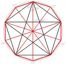 Gyldne trekanter ses også i en regulær tikant som den der ses i figuren til højre, hvor den er tegnet ind oven på et pentagram. Her er buelængden mellem hvert hjørne i tikanten nu 36°, og derfor er de ti trekanter med toppunkt i figurens centrum ensvinklede med ΔQPR i pentagrammet ovenfor og altså gyldne trekanter. Hvis vi kalder radius i tikantens omskrevne cirkel for r og tikantens sidelængde for s, kan man altså udtrykke følgende sammenhæng mellem r og s: