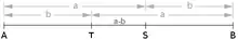 Det gyldne snit kan også foretages symmetrisk, som man ser på figuren til højre, hvor både S og T deler AB i det gyldne snit. Afstanden |ST| vil herved blive a-b. Det viser sig, at T også er det punkt, der deler liniestykket AS i det gyldne snit. Hvis vi antager, at det gælder, ser betingelsen nemlig sådan ud:
