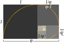 Phi har relation til fibonaccitalfølgen (1 1 2 3 5 8 13 21 osv.), fordi kvotienten af to naboelementer gradvist nærmer sig (konvergerer mod) tallet phi. Jo højere værdi, to naboelementer har, des mere nøjagtigt vil deres kvotient beskrive phi, og hvis naboelementernes værdi er 987 eller højere, vil unøjagtigheden være mindre end ±0,00001.