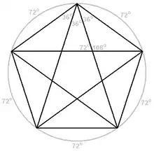 Et af stederne, hvor det gyldne snit optræder, er i en regulær femtakket stjerne, et pentagram. En sådan ses på på figuren til venstre omskrevet af en regulær femkant, en pentagon. Til højre er desuden indtegnet den omskrevne cirkel, og alle relevante vinkler er indtegnet. De fem vinkelbuer vil alle være på 360°/5 = 72°. Derfor er den spidse vinkel på en tak og dens to nabovinkler alle 72°/2 = 36°. Den spidsvinklede trekant i takken er ligebenet, så de to andre vinkler i trekanten vil være (180°-36°)/2 = 72°. De stumpe vinkler ved siden af disse vinkler vil være 180°-72° = 108°.