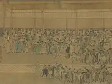 Kandidater samler sig om muren, hvorpå resultaterne blev offentliggjort. Maleri af Qiu Ying, ca. 1540
