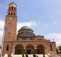 Indgangen til kirken med en statue af Konstantin XI Palaiologos