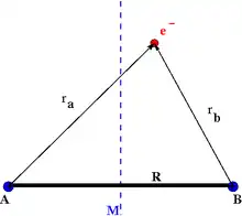De tre parametre der beskriver dihydrogen-kationen: afstanden mellem kernerne og afstandene og til elektronen og hver kerne. Ionen er symmetrisk omkring M.