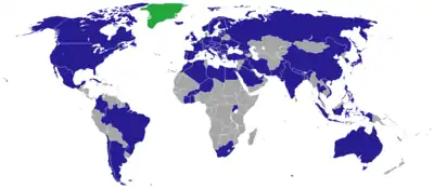 Kort over lande med diplomatiske repræsentationer i Danmark.