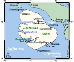 Disko (Grønlandsk Qeqertarsuaq den store ø) er navnet på en ø i det vestlige Grønland. Med et areal på 8.578 km² (lidt større end Sjælland, Lolland og Møn tilsammen) er den en af de 100 største øer i verden. Øen ligger ca. 100 km fra fastlandet, den er omkring 160 km lang, dens middelhøjde er 975 meter og dets højeste punkt er 1.919 meter over havet. Qeqertarsuaq (dansk navn Godhavn) er den største by på øen. Ca. 35 kilometer nord for Godhavn ligger øens eneste beboede bygd Kangerluk. De ca. 20 indbyggere lever af jagt og fiskeri. Indtil 1972 var der ved Qullissat på den nordøstlige del af øen en kulmine. Efter lukningen af minen blev beboerne 1972 forflyttet til byen Qeqertarsuaq på sydkysten af øen og til Ilulissat på grønlands vestkyst.