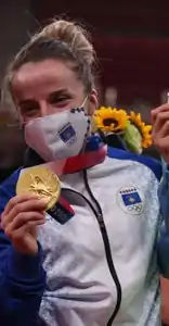 Hun repræsenterede Kosovo ved sommer-OL 2020, som var hendes debut ved et OL, og vandt guld i kvindernes 48 kg-konkurrence.[9][10][11]