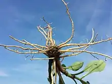 Plantens rod består af en kort, lodret eller lidt skrå rodstok. Fra den udgår de trævlede rødder og bladrosetten. Trods vækst i toppen af stokken bliver vækstpunktet i jordskorpen, da rødderne trækker sig sammen, og derved trækkes stokken nedad.