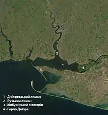 Vandområdet omfatter to dele: den brede Dnepr flodmunding (55 km lang og op til 7,4 til 16,7 km bred)[1] og den smalle Buh flodmunding (47 km lang og fra 5 til 11 km bred). Den dybden i flodmundingen er ca. 5 m, maksimalt 12 m.[1]