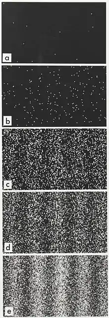 Først i 1961 udførte Claus Jönsson fra Tübingens universitet et dobbeltspalte-eksperiment med elektroner.[1] I 1974 udførte forskere ledet af Pier Giorgio Merli fra LAMEL-CNR Bologna i laboratoriet ved Milanos universitet et dobbeltspalte-eksperiment, hvor elektronerne blev sendt enkeltvis gennem eksperimentets bane. Dette er banebrydende eksperimenter og forklaring følger. Man formodede eller kunne ikke udelukke at fotoner og elektroner påvirkede hinanden gensidigt og det kunne være forklaringen på interferensmønsteret. Men det overraskende er, at selv om elektroner sendes enkeltvis gennem dobbeltspalte-eksperimentet, fås samme interferensmønster.