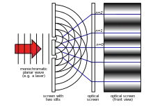 Venstre tegningspalte: Tegningen viser en principskitse af Thomas Youngs oprindelige eksperiment. Spalternes (eng. slits) retning er ind i skærmen i kassen (ovenfor den blå vandrette dobbeltdelelinje) - og skærmen nedenfor vises drejet så den er i spalternes lodrette retning - men venstre spaltes skærm viser ikke dobbeltspalte-eksperimentets resultat - blot at her placeres det.
