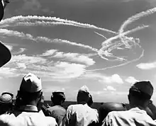 | “Luftslaget udvikler sig til en ‘dog-fight’, små grupper af flyvemaskiner engagerer hinanden i en kamp til døden.”[4] | ||