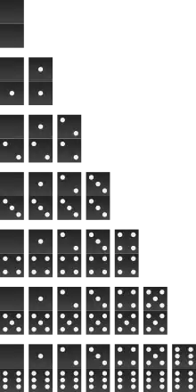 Antallet er brikker kan udregnes med følgende formel, hvor dobbelt n domino-brikker er og antallet af øjne er .