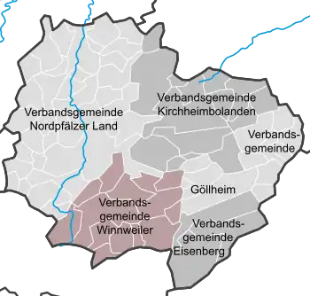 ![]() Lage des Donnersbergkreis in Rheinland-Pfalz (anklickbare Karte) | |