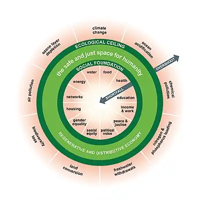 Grundtanken bag diagrammet var at udvikle en økonomi-model, hvor befolkningers behov kan tilgodeses, uden at det fører til kritisk belastning af jordklodens økologiske systemer.[4] Dette fordrer et opgør med traditionel økonomisk tænkning og udpegning af nye målsætninger. Ifølge doughnut-modellen opfattes en økonomi først som velstående, når alle tolv områder af menneskelig velfærd ligger tilstrækkeligt højt, uden at nogen af de ni økologiske parametre er blevet overskredet, dvs inden for det grønne område, se figur.