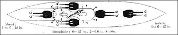 Hvis alle tårnene var placeret på skibets midterlinje var belastningerne på skibets struktur forholdsvis små. Det betød også at alle de store kanoner kunne affyres i en bredside, mens færre kunne skyde fremad eller bagud. Det betød også at skroget skulle være længere, hvilket gav skibsbyggerne nogle udfordringer, da et længere skib måtte have en større pansring for at få den samme beskyttelse, og magasinerne som betjente hvert tårn greb ind i placeringen af dampkedler og maskiner.[41] Af disse årsager blev HMS Agincourt fra 1913, som havde ikke mindre end 14 12-tommer kanoner i syv tårne på midterlinjen ikke anset for at være en succes.[42]