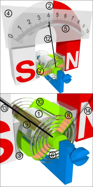 Spolen sidder mellem polerne på en permanent magnet, sådan at magnetfeltets kraftlinjer står vinkelret på den akse, som spolen kan drejes om. Et par spiralfjedre (6), som kan justeres mekanisk med en stilleskrue (11), sørger for, at når der ikke går nogen strøm i spolen, føres spolen til en hvilestilling, hvor dens sider ligger parallelt med magnetfeltet, og viseren peger på "0" på skalaen – disse fjedre er desuden elektrisk ledende og tjener som "tilledninger" for den bevægelige spole.