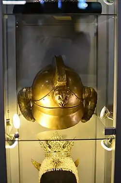![]() Den gyldne hjelm, som røverne stjæler udstillet på Mosfolms museum i Moskva | |
