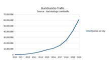 Udviklingen i antal søgniger ved hjælp af DuckDuckGo siden 2010