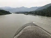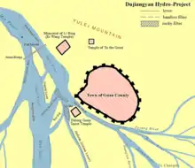 ![]() Kunstvandingssystemet ved Du Jiang Yan afleder vand fra Minjiang floden, sådan at Chengdu bliver forsynet med ferskvand. Desuden gør systemet, at man undgår oversvømmelse af Chengdusletten. Afledningsslusen Baopingkou i forgrunden til venstre sender vand fra den indre flod ned via en akvædukt til Chengdu og tillader overskydende vand at fortsætte ned ad Minjiang floden. Overløbet Feishayan er til venstre for Baopingkou og ses ikke på billedet. | |