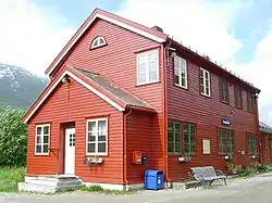Stationsbygningen blev opført i 1947 efter tegninger af Gudmund Hoel og M. Løken. Den toetages bygning er opført i træ og rummede oprindeligt ekspedition, telegraf, ventesal og restaurant i stueetagen samt en tjenestebolig på første sal. Desuden er der en enetages tilbygning, der oprindeligt fungerede som pakhus. Den tresporede remise blev opført i beton i 1955 efter tegninger af J. Kristiansen. Derudover er der 15 overnatningsbygninger, funktionærboliger og banevogterboliger, der blev opført fra 1946 til 1955, blandt efter tegninger af G. Nordtvedt. De er nu solgt fra til private.