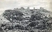 The village probably takes its name from the ancient castle which occupied the summit of the rock. In time of yore it was known by the names of Dincolyn, Castell-y-Ffaidon, and Castell Ceri, and is supposed to have been the last of the chain of British posts on the Clwydian hills.