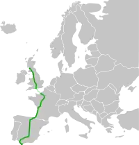 E5 er en europavej der begynder i Greenock i Skotland og ender i Algeciras i Spanien. Undervejs går den blandt andet gennem: Glasgow og Gretna i Skotland; Carlisle, Penrith, Preston, Warrington, Birmingham, Newbury og Southampton i England ...(ingen direkte forbindelse)... Le Havre, Paris, Orléans, Tours, Poitiers og Bordeaux i Frankrig; San Sebastián, Burgos, Madrid, Cordoba, Sevilla og Cádiz i Spanien.[1]