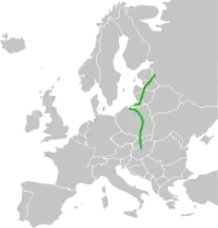 E77 er en europavej der begynder i Pskov i Rusland og ender i Budapest i Ungarn. Undervejs går den blandt andet gennem: Estland; Riga i Letland; Šiauliai i Litauen; Kaliningrad i Rusland ...(ingen direkte forbindelse)... Gdańsk, Elbląg, Warszawa, Radom og Kraków i Polen; Trstená, Ružomberok og Zvolen i Slovakiet.[1]