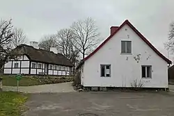 ![]() Bindingsværkshuset E Bindstouw ses til venstre. Bygningen til højre er det såkaldte kustodehus, som blev nedrevet 2020. | |