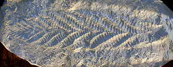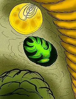 - Fossiler som Pteridinium er bevaret i sedimentlagene og minder om “mudderfyldte sække”, men der hersker langtfra enighed i forskerkredse om hvordan disse fund skal forstås.[33]