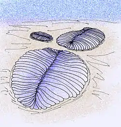 - Cirkulære fossiler der dominerede de første fund, så som Ediacaria, Cyclomedusa og Rugoconites, og på grund af deres form blev Ediacara-faunaen i begyndelsen fejlklassificeret som meget primitive medlemmer af cnidaria, som bl.a. omfatter vandmænd og koraller.[7] Senere undersøgelser har dog betydet at ingen af de skiveformede typer helt har kunnet blive karakteriseret som cnidaria. Alternative fortolkninger inkluderer protister[31] og søanemoner; eller at de ligefrem er mikrobielle kolonier.[32] Vigtige karaktertræk mangler dog, da kun undersiden af disse typer organismer bevares som forsteninger.