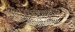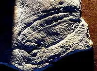 - Denne kringlede betegnelse omfatter forsteninger af arter, hvor detaljer af komplekse strukturer er bevaret med træk, der ligner karakteristika fra kambriske dyregrupper. De er derfor i nogle tilfælde blevet tolket som potentielle stamformer til senere dyreliv, og derfor i visse definitioner, ikke en del af den unikke Ediacara-fauna. Det første eksemplar fra denne gruppe var den formodede bilaterat, Vernanimalcula, men i dag er det dog alment accepteret at det drejer sig om en senere aflejring i en ægsæk eller en acritarch.[26] Senere fund, hvor der er konsensus omkring deres bilateralitet, omfatter den bløddyrslignende Kimberella,[35] Spriggina (afbildet),[36] samt efterfølgende, tiltagende forskelligartethed af dyr.[37] Ligeledes den skjoldformede Parvancorina,[38] hvis slægtskabsforhold stadig debatteres heftigt.[39]