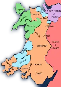 Kongelige områder efter erobringen      "Principality of North Wales"[note 2]      Other direct rule landsMarch of Wales     Marcher lordships