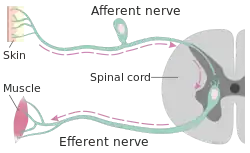 Efferente nervefibre henviser til aksonale fremspring, der går ud af en bestemt region; i modsætning til afferente fremspring, der ankommer til regionen. Disse udtryk har en lidt anden betydning i forbindelse med det perifere nervesystem (PNS) og centralnervesystemet (CNS). Den efferente fiber er en lang proces, der kommer langt fra neuronens krop og bærer nerveimpulser væk fra centralnervesystemet mod de perifere effektororganer (hovedsageligt muskler og kirtler). Et bundt af disse fibre kaldes en motorisk nerve eller en efferent nerve. Den modsatte retning af neurale aktiviteter er afferent ledning,[1][2][3] som bærer impulser ved hjælp af de afferente nervefibre i sensoriske neuroner.