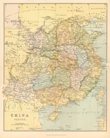- "Det egentliga K., eller "de 18 provinserna" (Kin. Sji-pa-tjeng), omfattar den sydöstra delen af kinesiska väldet mellan hafvet i s. ö., Annam och Birma i s., Tibet i v. samt Mongoliet och Mandsjuriet i n., der kinesiska muren bildar gräns. Nordisk Familjebok Arkiveret 25. november 2015 hos Wayback Machine (1884), band 6, s. 687.