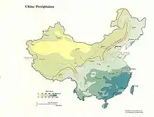 Regnen falder væsentlig i sommerhalvåret, og regnmængden aftager fra syd til nord: Hongkong 229,1 cm, Shanghai 116,9 cm, Peking 64,2 cm. Vinterhalvåret med sine vedholdende landvinde må naturligvis være meget tør. Særlig i Nordkina er regnen strengt periodisk og vinteren meget fattig på nedbør. Regntiden varer fra juni til september med maksimum i juni. Ved Jang-tse-kiang er vinteren langt fra i den grad uden nedbør, og regntiden begynder allerede i marts eller april, men den største regnmængde falder ligeledes i juni. Ved kysten synes at være to maksima for regnen i juni og august, men de enkelte år kan variere stærkt. I det hele synes det indre at have mest regn om foråret, kysten om eftersommeren.