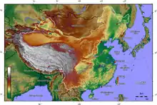 Kina har mange forskellige landskaber, med bjerge og bjergplateauer som dominerer i vest, og lavland i øst. Man kan skelne mellem det kinesiske lavland, der som hovedregel ligger mindre end 200 meter over havet, og et højland, der som hovedregel ligger mellem 200 og 1500 meter over havet, stedvis dog højere. Det kinesiske lavland ligger som et forholdsvis samlet område mod nordøst til tilknytning til Det Gule Hav og til dels den nordlige del af Det Østkinesiske Hav, mens højlandet dominerer mod sydøst, det vil sige i tilknytning til den sydlige del af Det Østkinesiske Hav og til Det Sydkinesiske Hav.