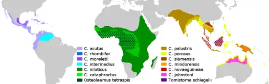 Der findes omkring 14 arter af egentlige krokodiller fordelt på tre slægter, de fleste i Crocodylus.