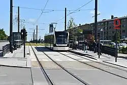 Letbanen ligger i en græsbelægning på den vestlige side af vejen. Stationen ligger lige syd for krydset og består af to spor med hver sin sideliggende perron.[4][5]