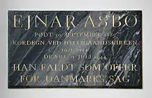 En mindetavle for Asbo er opsat i Helligåndskirken, og en mindesten med portrætrelief i bronze findes på Mellerup Valgmenigheds Kirkegård.[4]